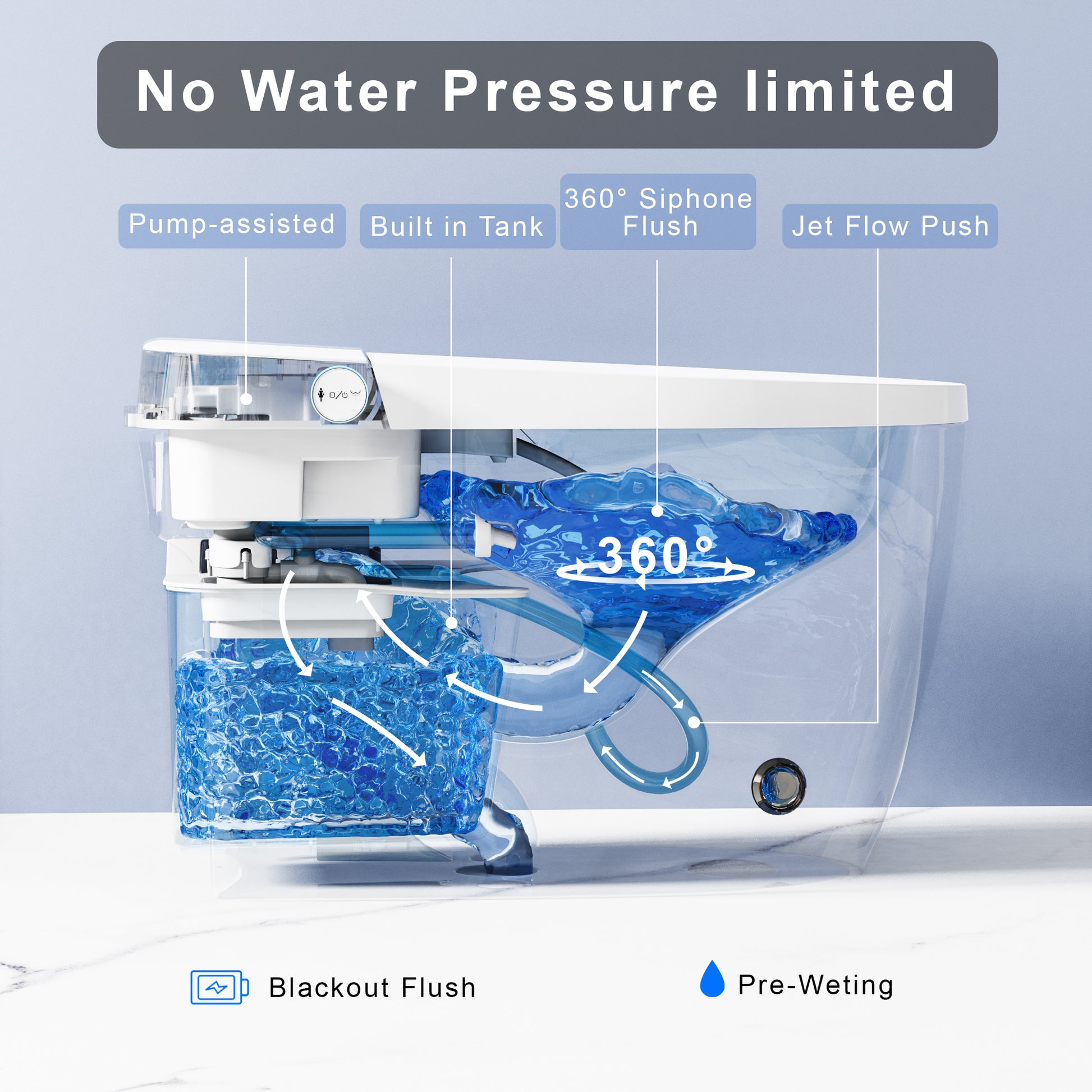 - Built-in Tank & No Water Pressure Limit :This one piece bidet toilet equips a 5.5L built-in tank and turbocharged pump, our smart toilet with bidet built in delivers powerful flushes even in low water pressure homes. The super whirlpool siphon jet ensures thorough, quiet cleaning with zero residue. It auto-flushes intelligently: detects usage time to optimize water—3.3L for half flush (used under 1 min) or 4.7L for full flash (used over 1 min).