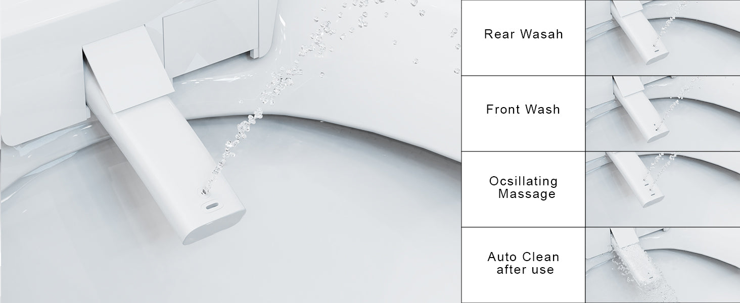 - Simplified Controls & Safety Protections: One-Touch knob simplifies operation: twist to select Flushing, Front/Rear/Oscillating wash. Foot-press button (lower right) enables hands-free lid control and flushing for men. Durable physical buttons ensure reliable use. Safety features: ① Startup self-check ② Dry Operation Protection ③ Voltage Protection ④ Leakage Detection ⑤ Low Voltage Safety ⑥ IPX4 Water Resistance ⑦ Temperature Control. Combines easy-clean functionality with user-friendly design.